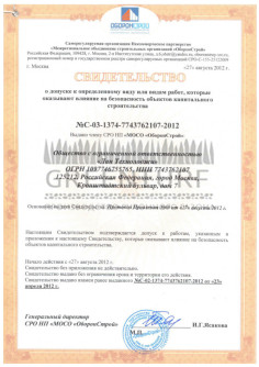 • Свидетельство о допуске к определенному виду или видам работ, которые оказывают влияние на безопасность объектов капитального строительства №С-03-1374-7743762107-2012
